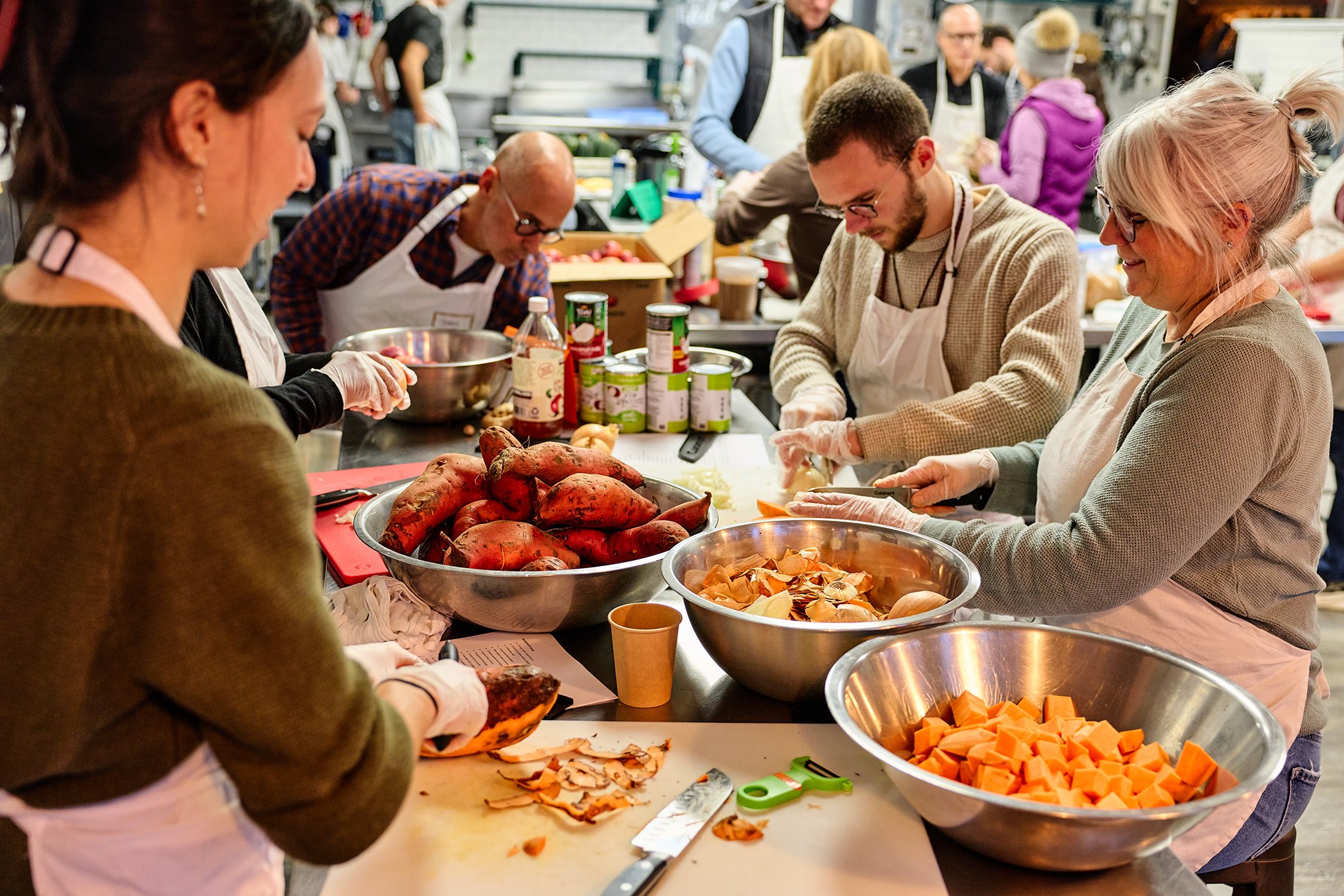 We work in teams to collectively prepare on average 100 meals in a three-hour class. We believe that the joy experienced in the kitchen can be felt in the meals. As part of the event, we build in time for connection, and provide abundant snacks and beverages that are customized for the dietary needs of the group.